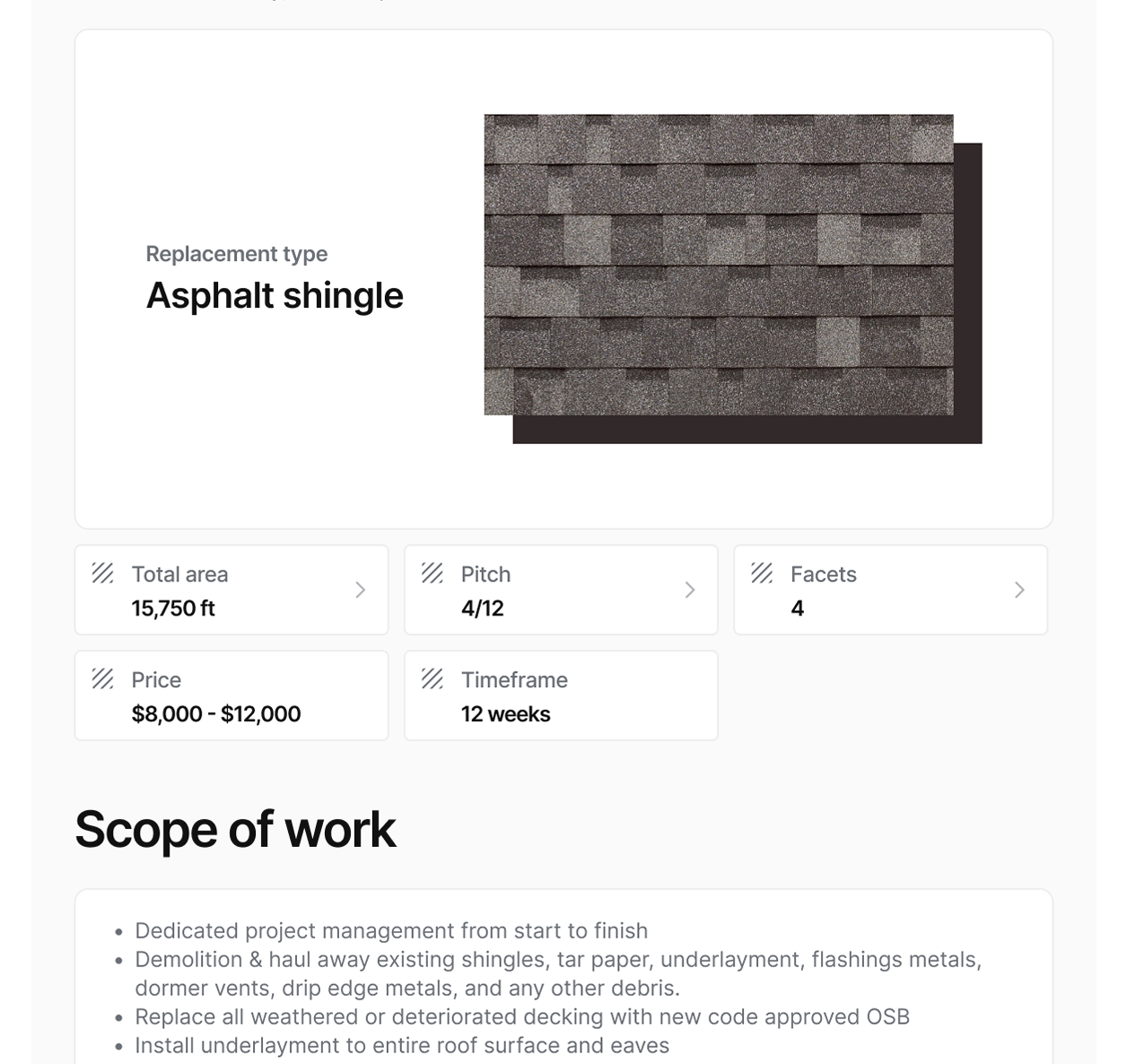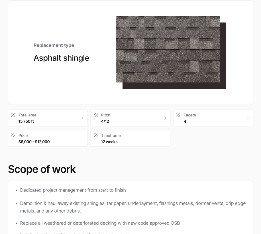 Our quote assessment tool and roof replacement plans cover a variety of popular, premium roof types and materials to make sure any contractor can easily source what's specified.