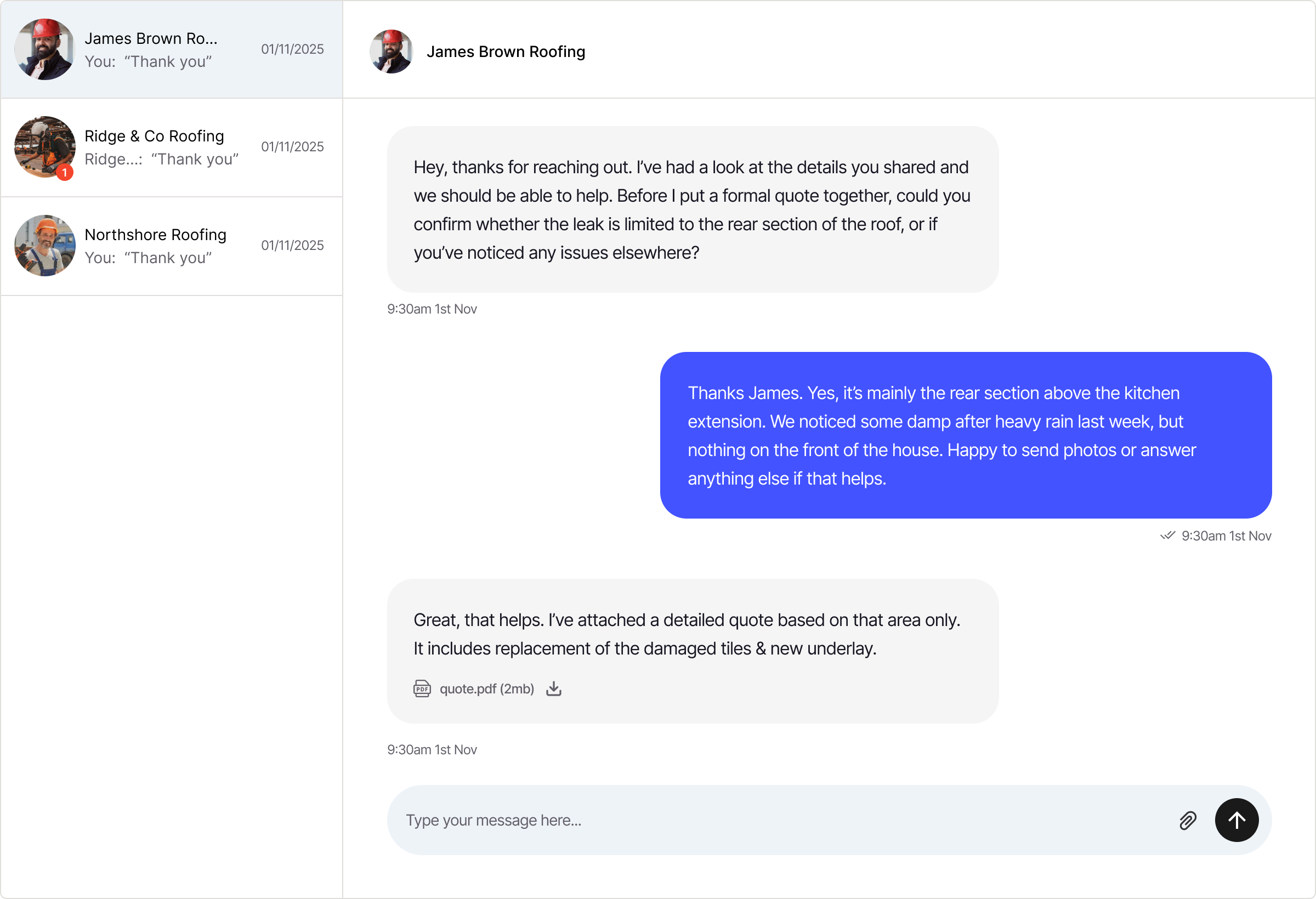 Chat to understand your roofing issue, key terms, costs, and next steps so you can make confident decisions.